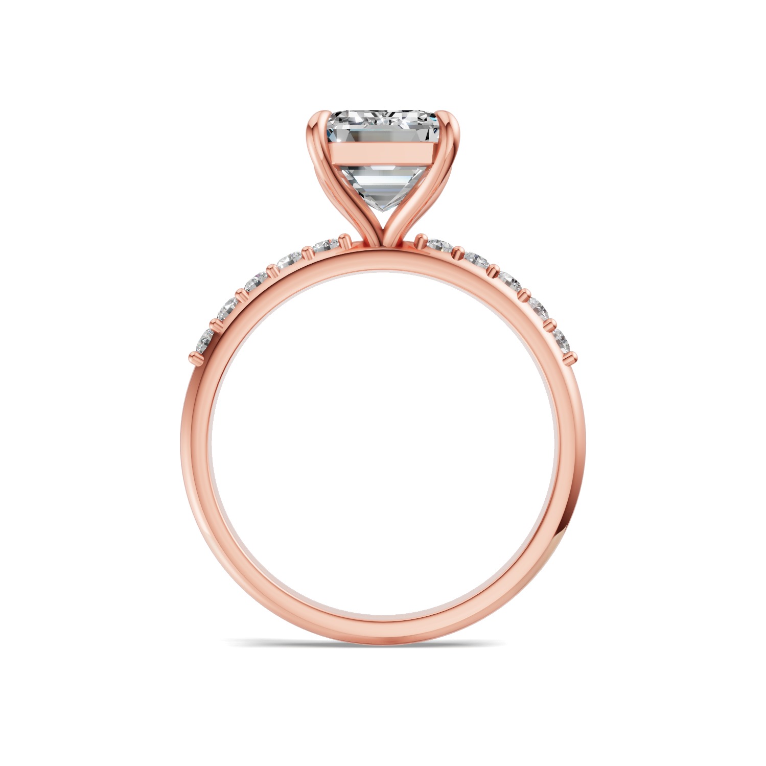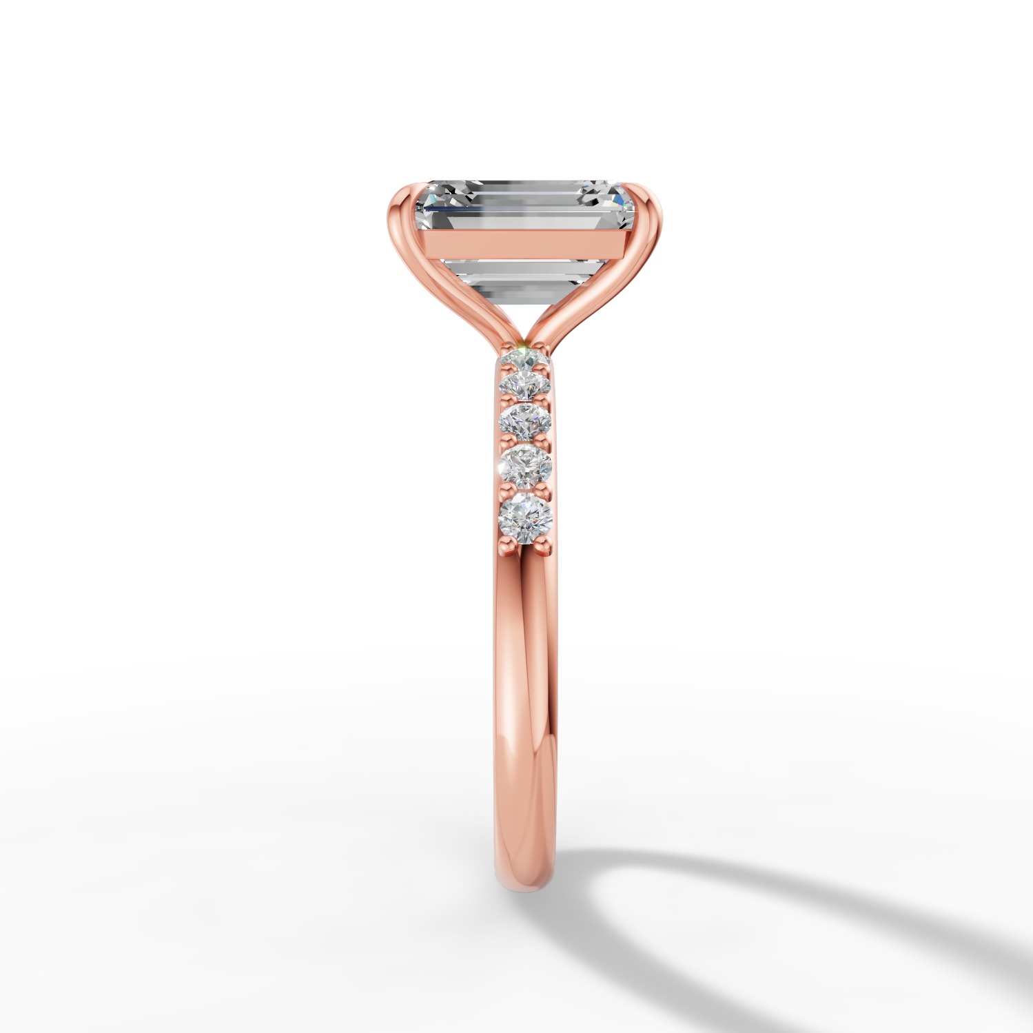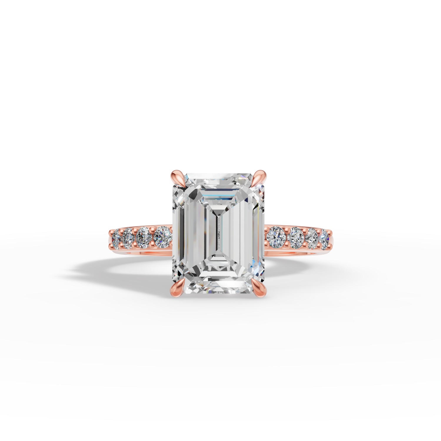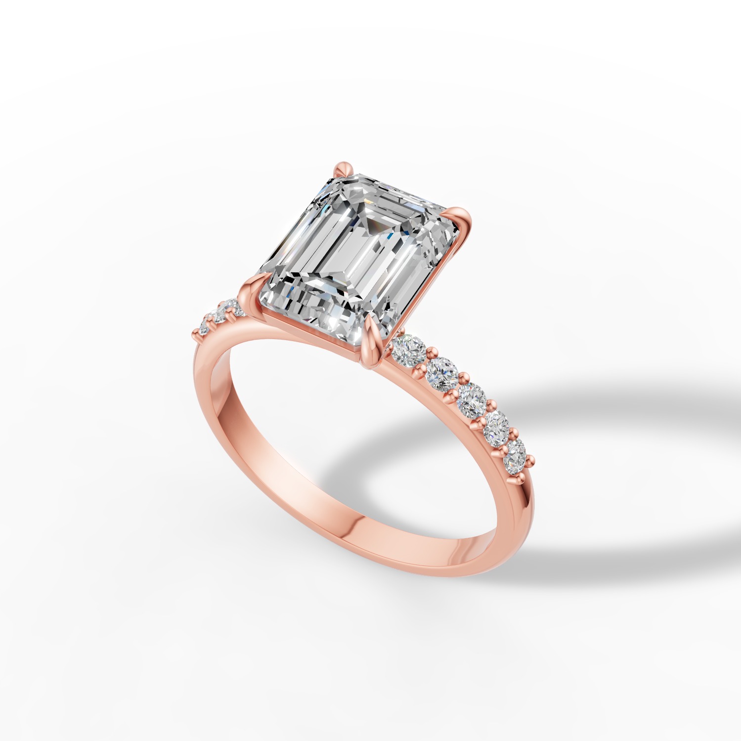 Zakochaj się w pierścionku Anastasia – wyjątkowej biżuterii dla wyjątkowych kobiet. Diament o szlifie szmaragdowym jest stworzony dla fanów ponadczasowej elegancji oraz stylu old money. Obrączka z różowego złota ozdobiona dziesięcioma drobnymi diamentami doskonale dopełnia kompozycję, tworząc efekt harmonii i klasy.