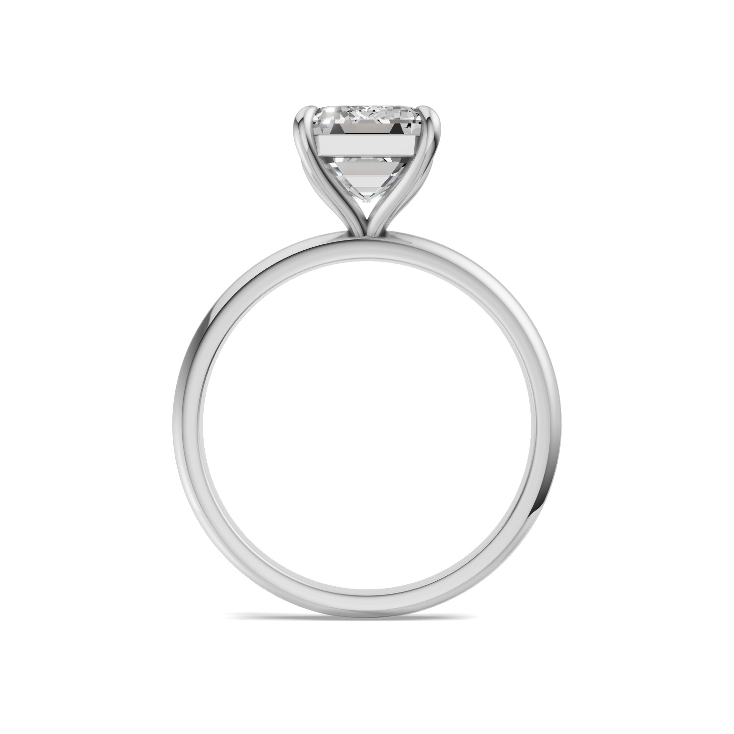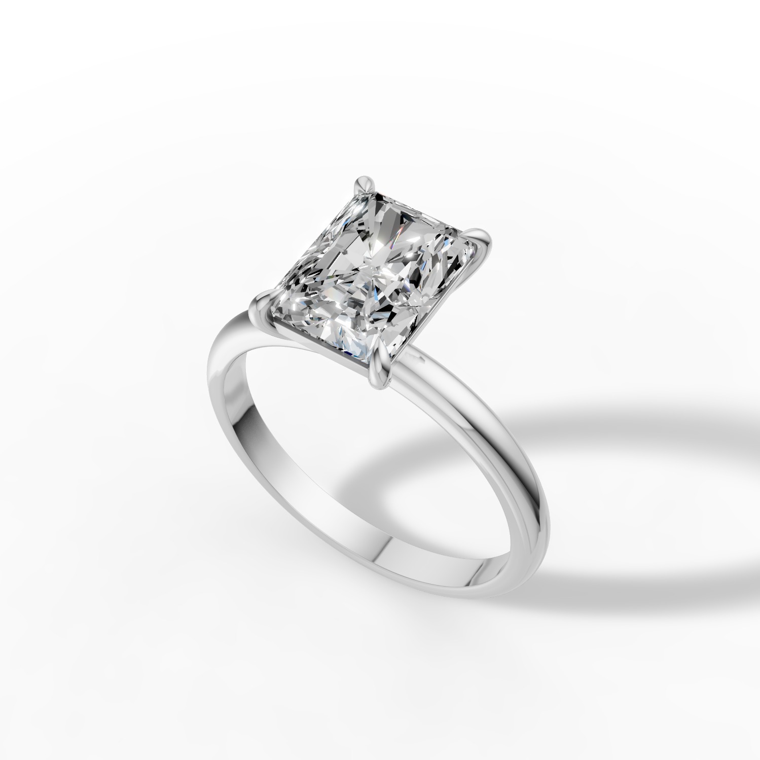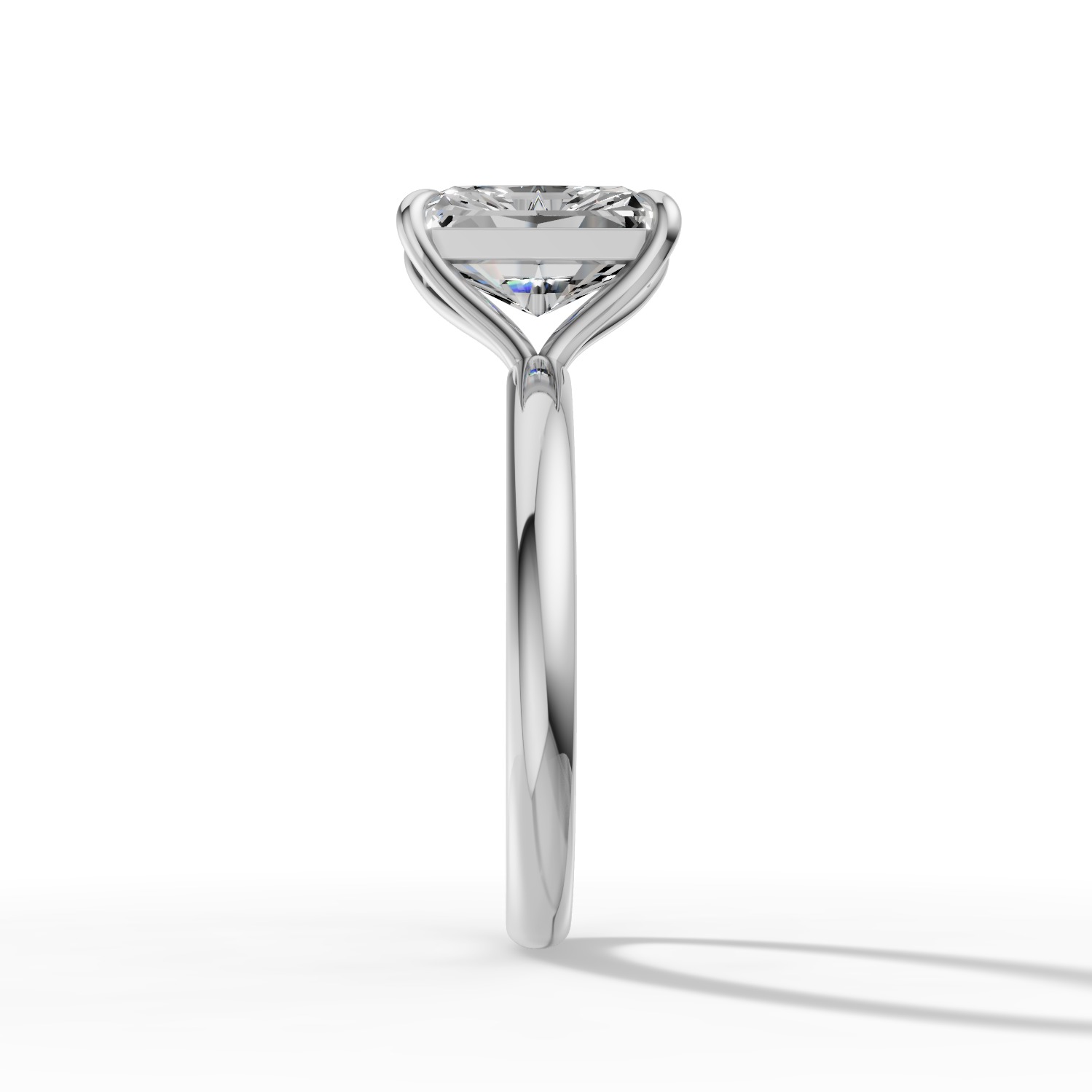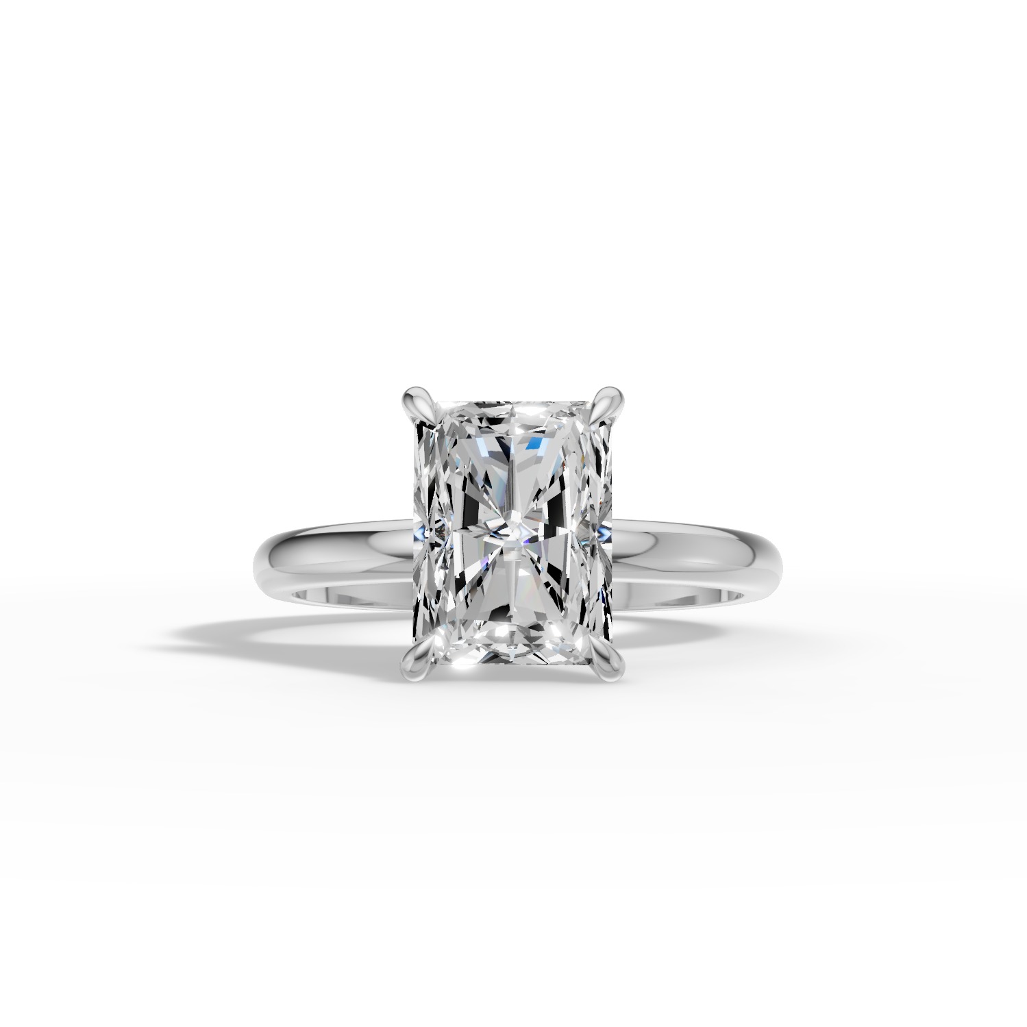 Model zachwyca centralnym diamentem o szlifie radiant oraz obrączką w kolorze białego złota.