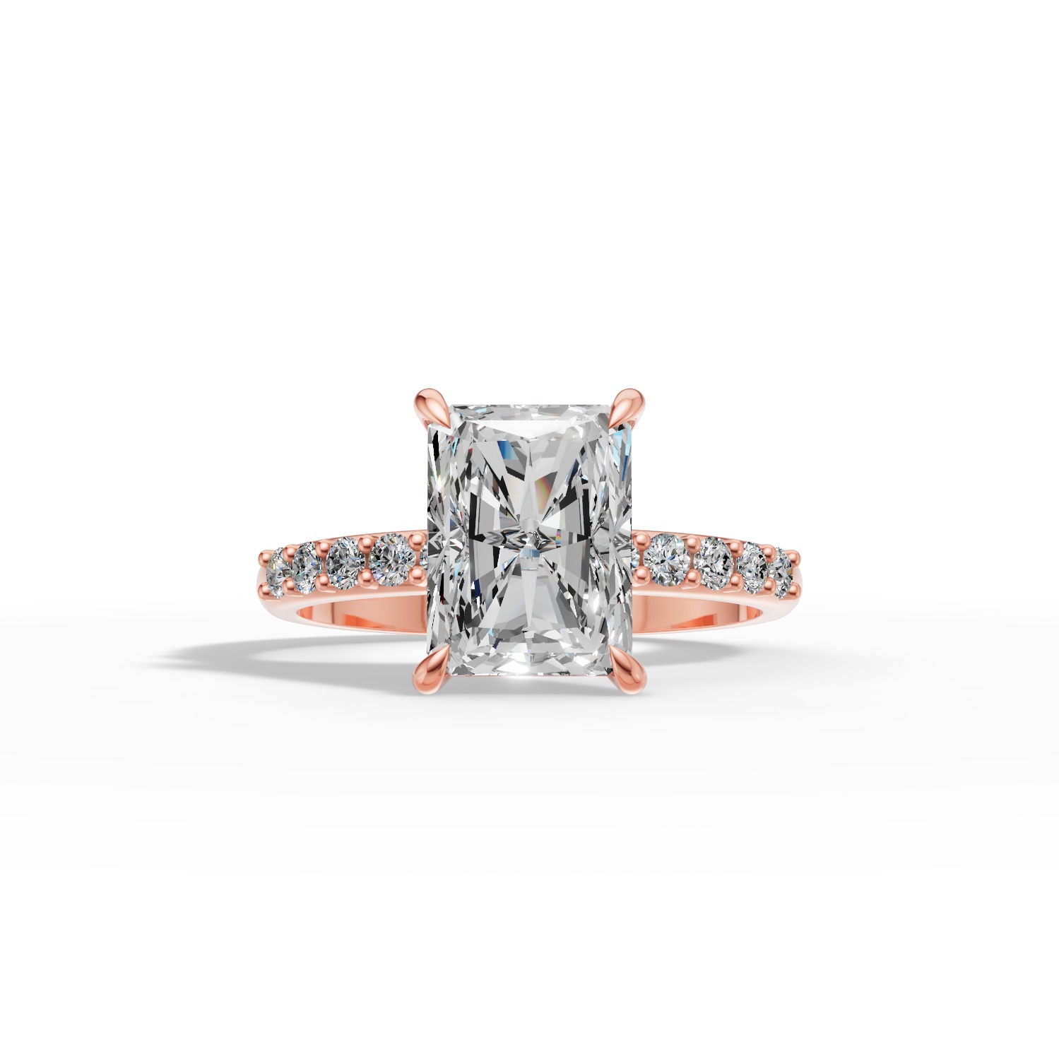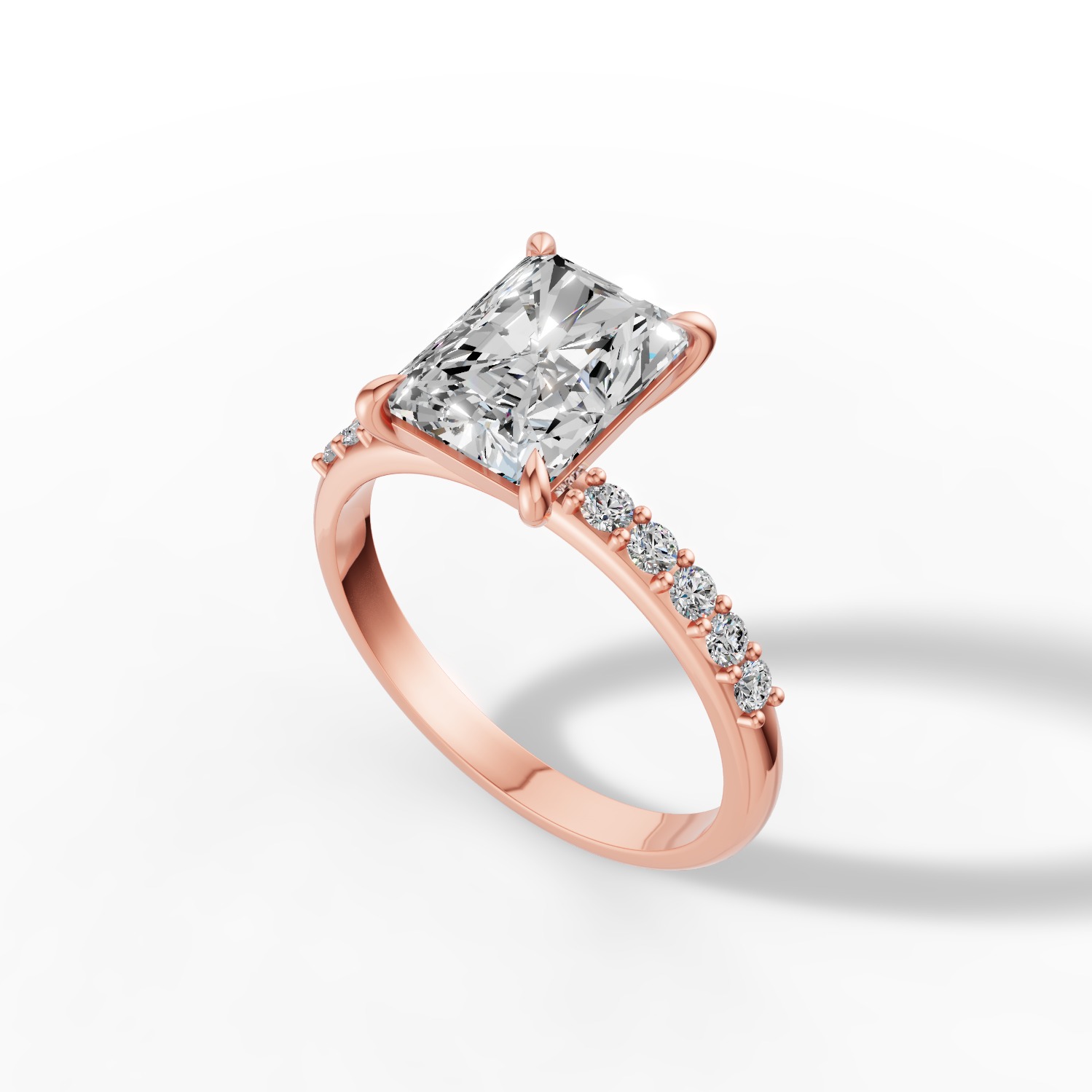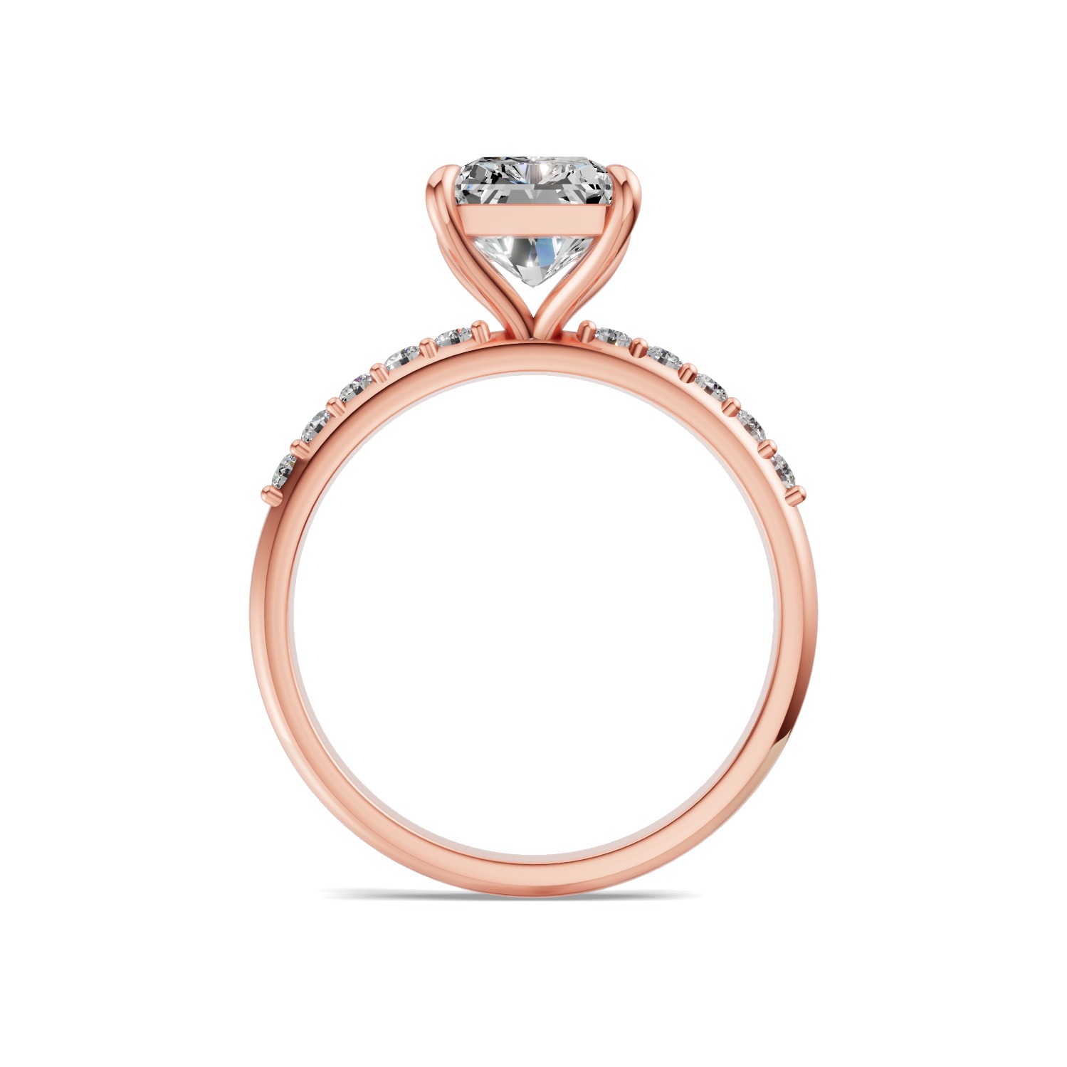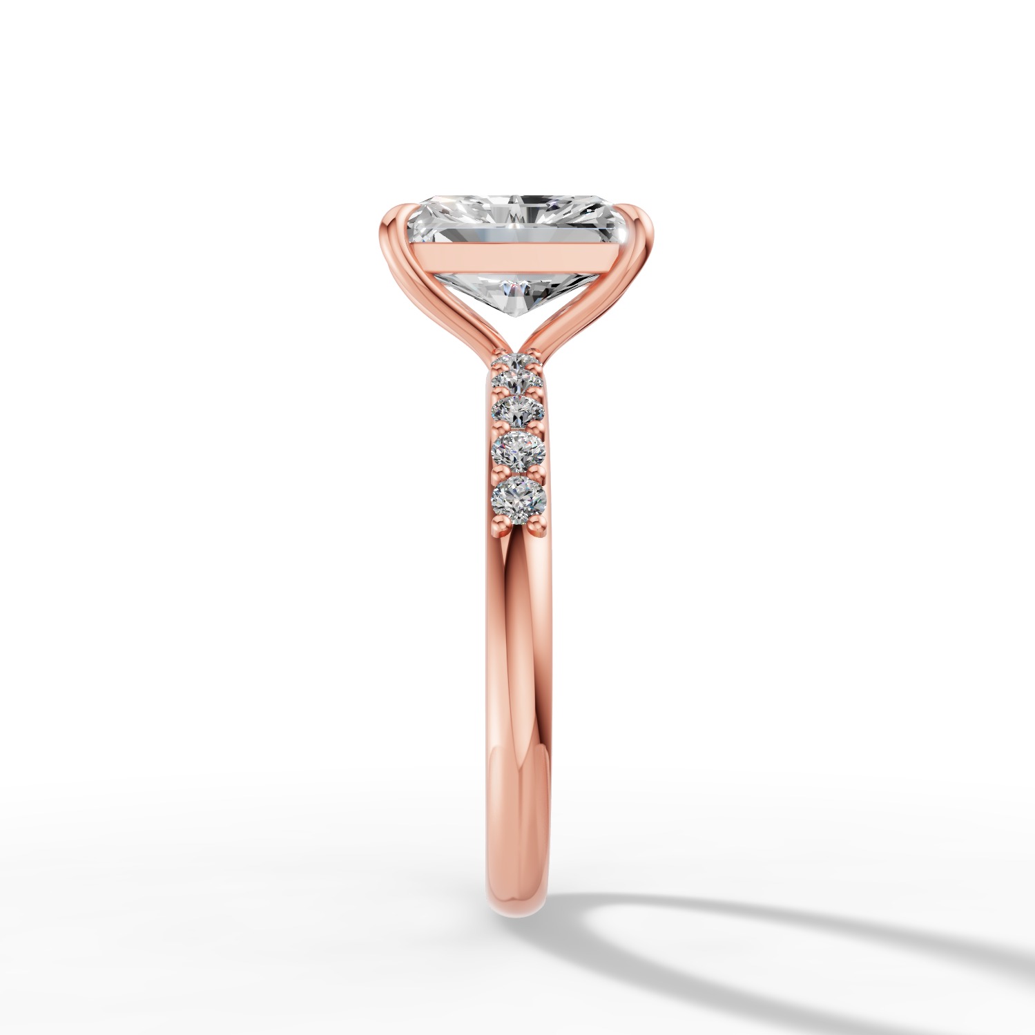 Model zachwyca centralnym diamentem o szlifie radiant, otoczonym subtelnym blaskiem dziesięciu drobnych diamentów oprawionych w obrączkę w kolorze różowego złota.