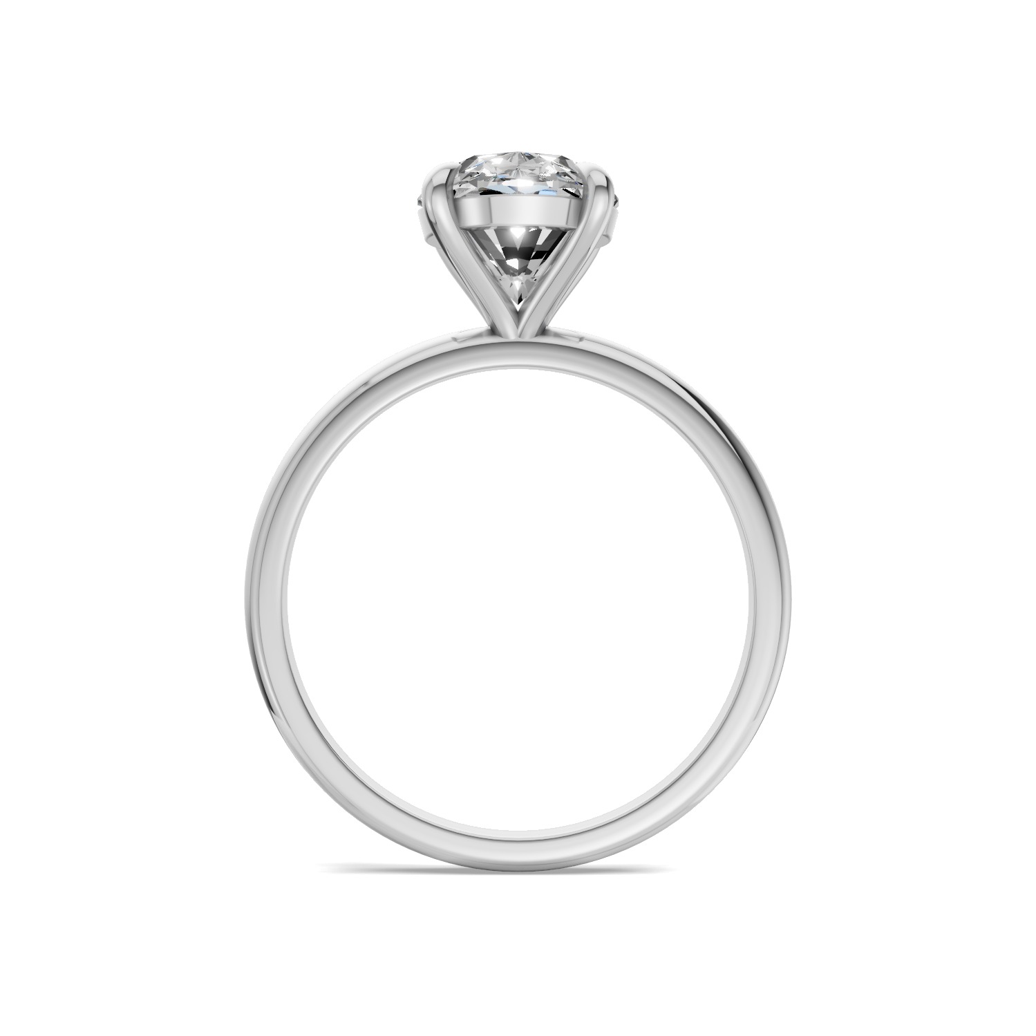Smukła obrączka wykonana z białego złota podkreśla kształt kamienia, tworząc harmonijną całość.