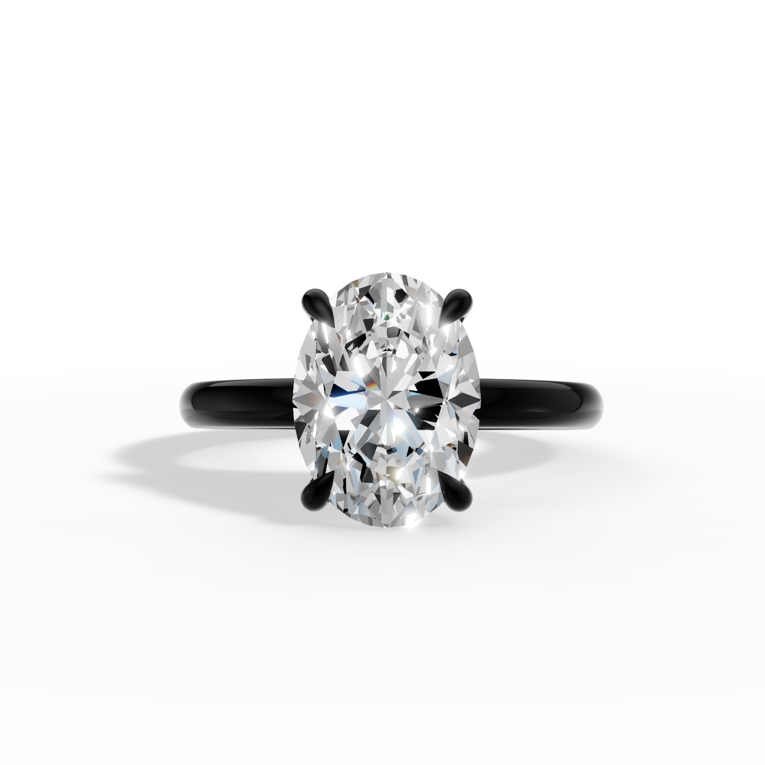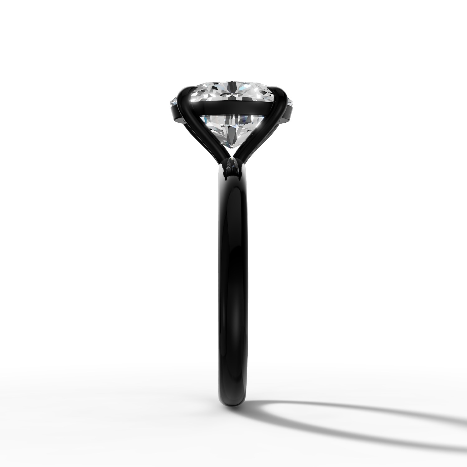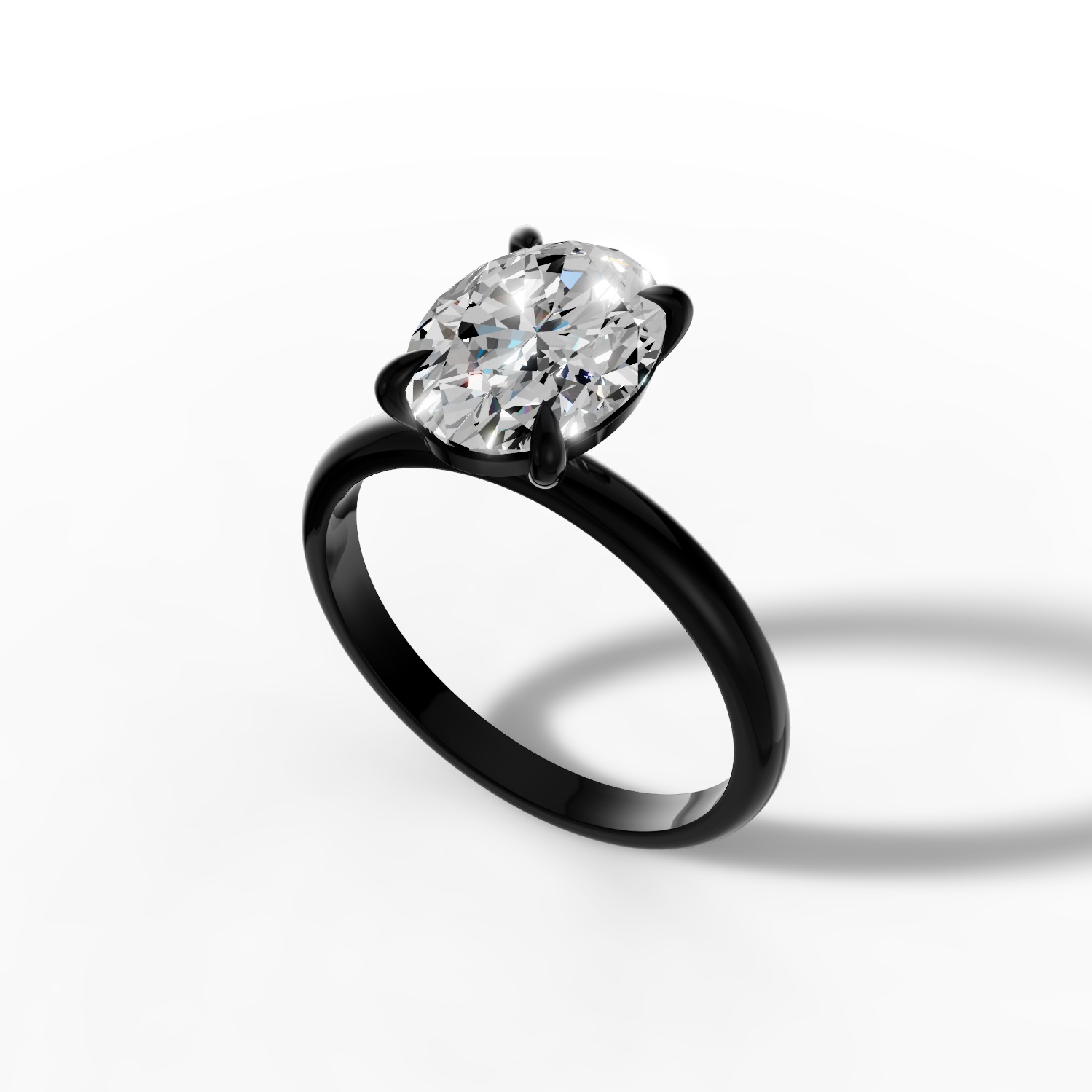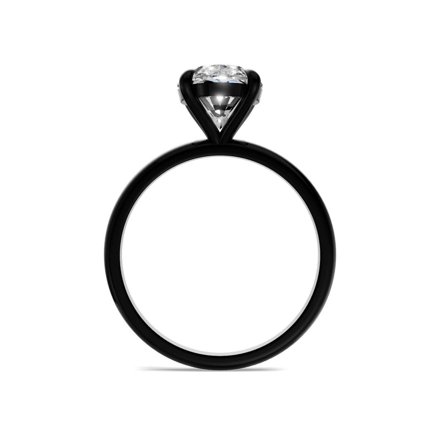Smukła obrączka wykonana z czarnego złota podkreśla kształt kamienia, tworząc harmonijną całość.