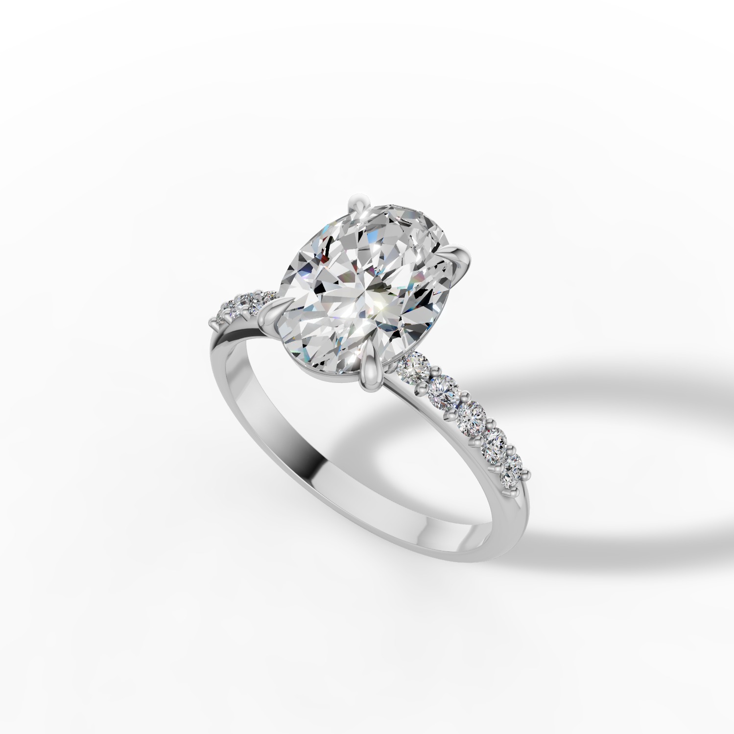 Pierścionek Selene zachwyca swoją prostotą i klasycznym pięknem. Centralny diament o szlifie owalnym przyciąga uwagę subtelnym blaskiem i eleganckimi proporcjami. To model, który łączy ponadczasową formę z delikatnym, kobiecym charakterem. Na obrączce wykonanej z białego złota umieszczono dziesięć diamentów dopełniających kompozycję.