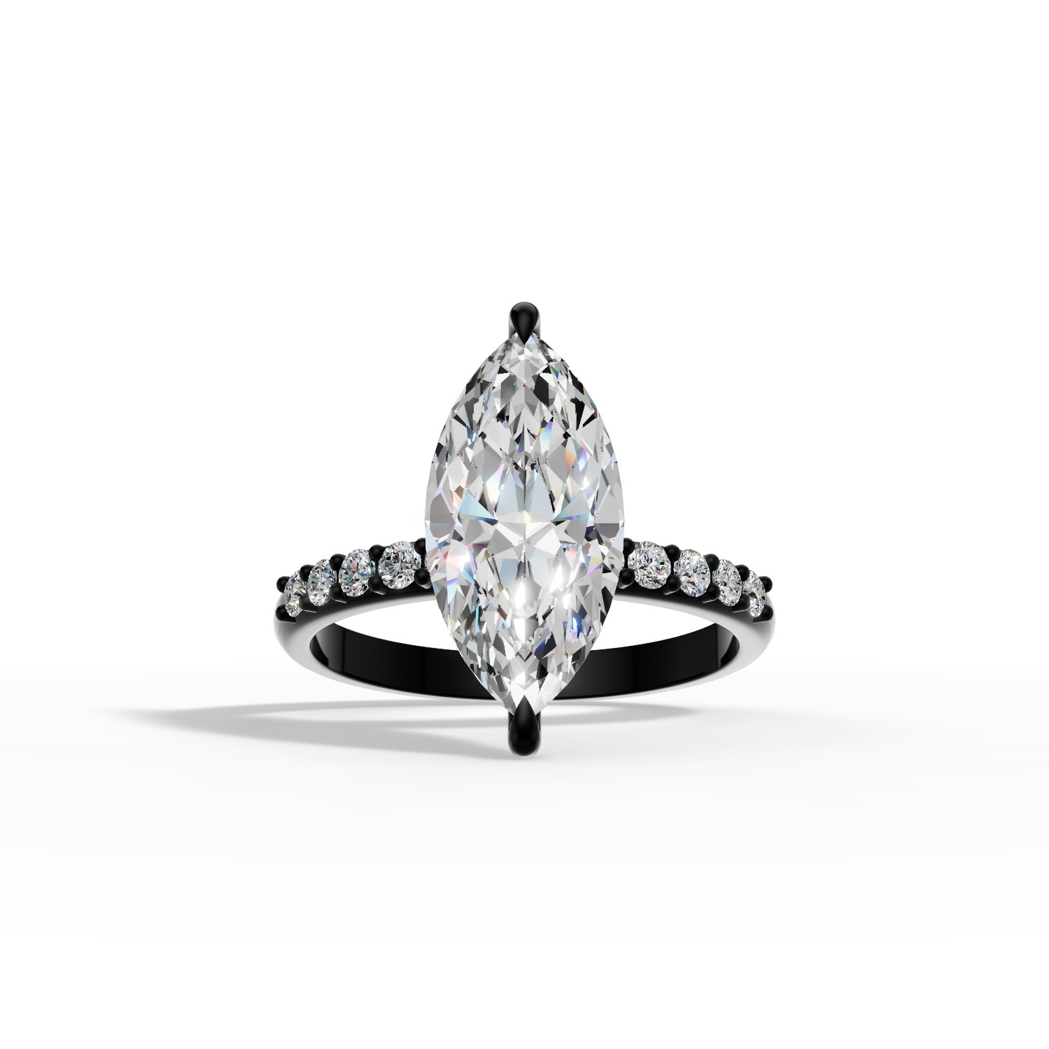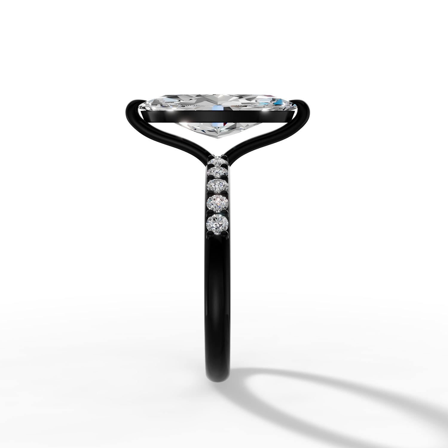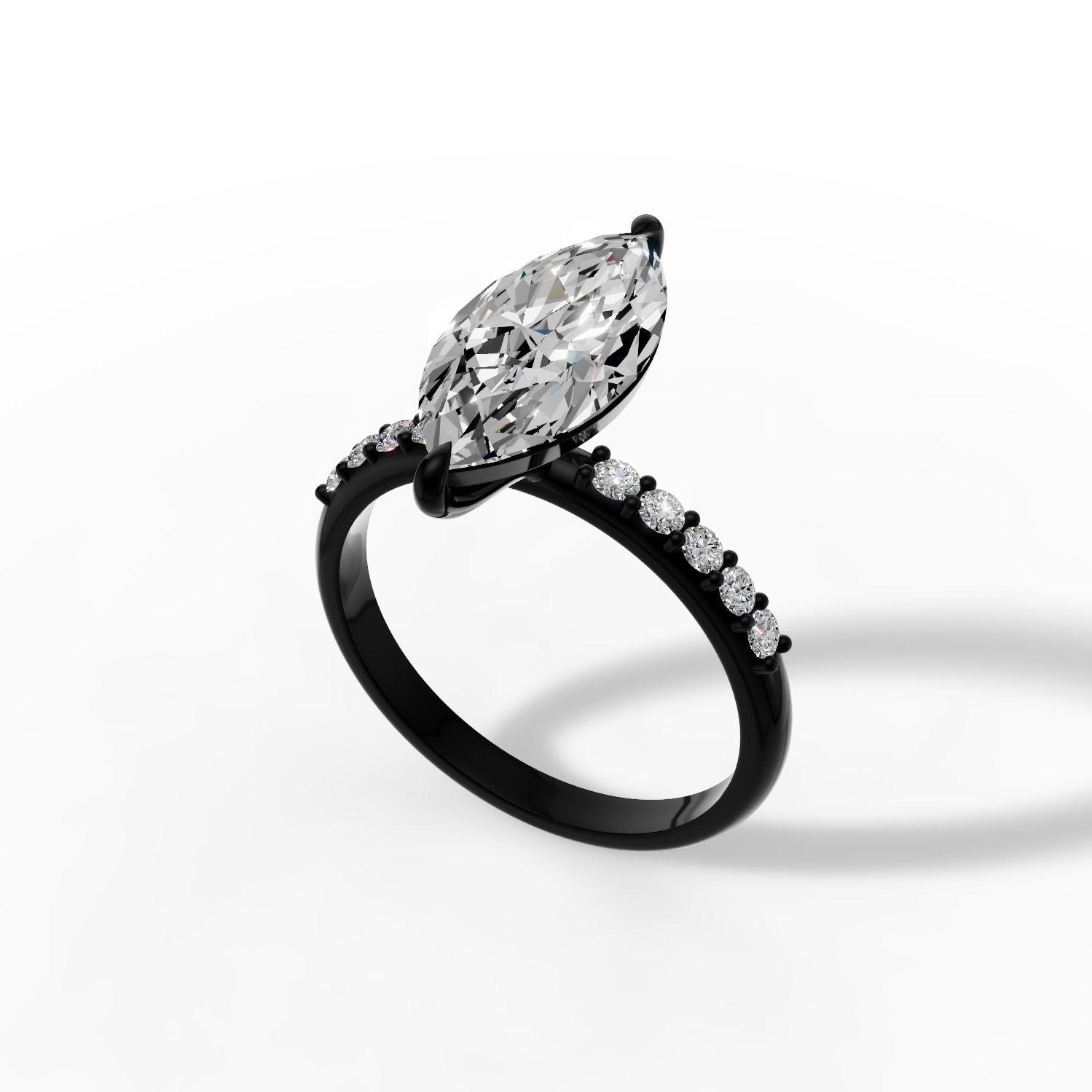 Pierścionek Seraphina został stworzony z myślą o kobietach, które cenią elegancję w najczystszej formie. Jego wydłużony kształt i harmonijna proporcja nadają mu lekkości, a subtelny blask sprawia, że zachwyca w każdym świetle. To wzór, który łączy klasykę z nowoczesnym wdziękiem – prosty, szlachetny i pełen kobiecego uroku. Diament o szlifie markiza osadzony w obrączce z czarnego złota zachwyca prostotą i elegancją. Obrączkę uzupełnia dziesięć delikatnych diamentów dla jeszcze większego blasku.
