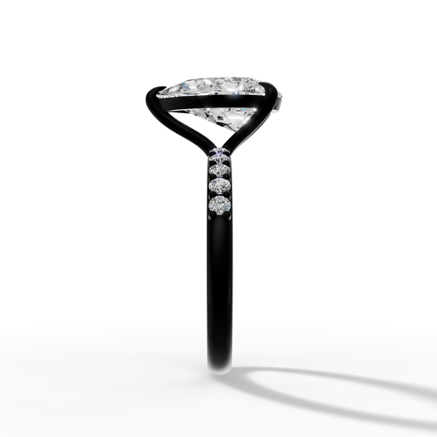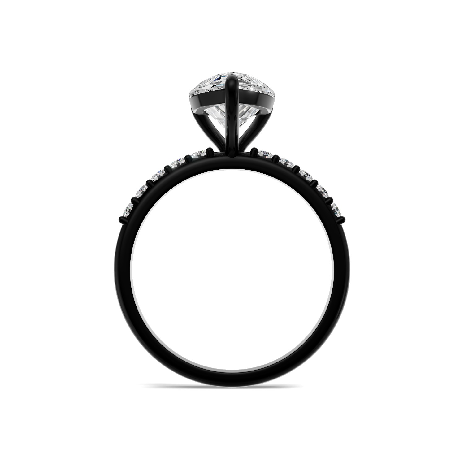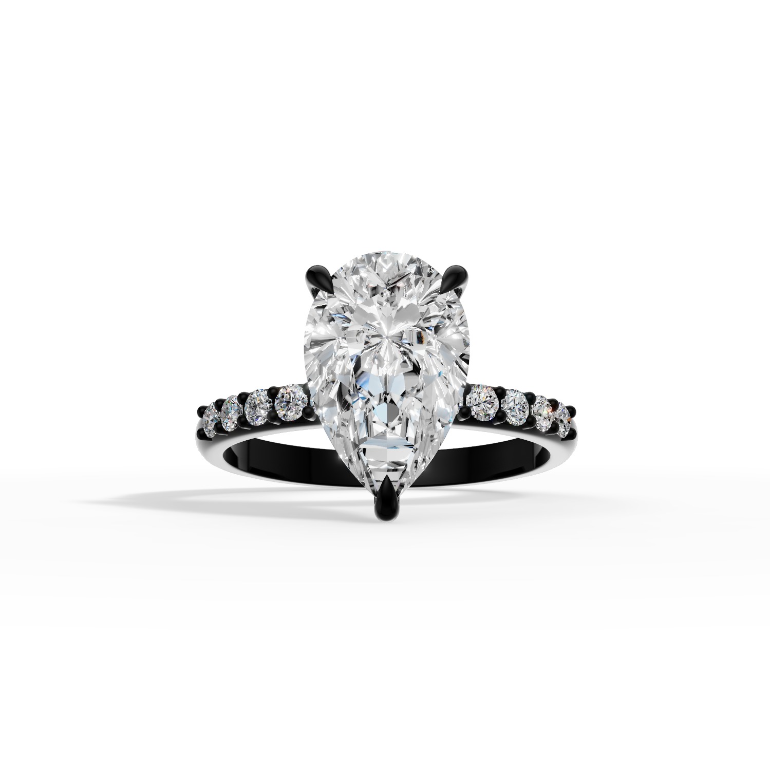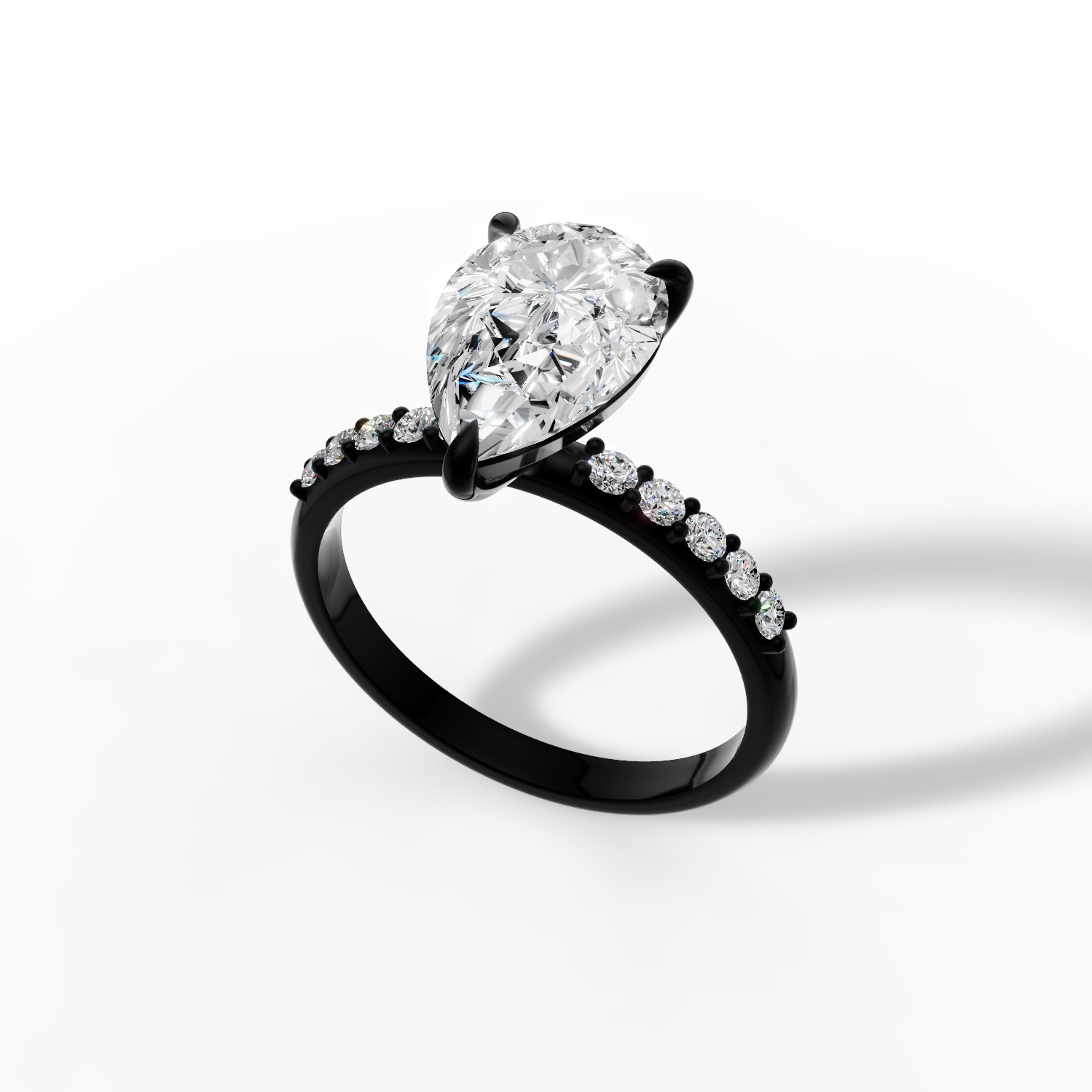 Centralny diament w kształcie gruszki to nie tylko symbol wiecznej miłości, ale także wyraz indywidualnego stylu. Osadzony w oprawie z czarnego złota oraz ozdobiony dziesięcioma drobnymi diamentami na obrączce, przyciąga wzrok czystym blaskiem i ponadczasową elegancją.