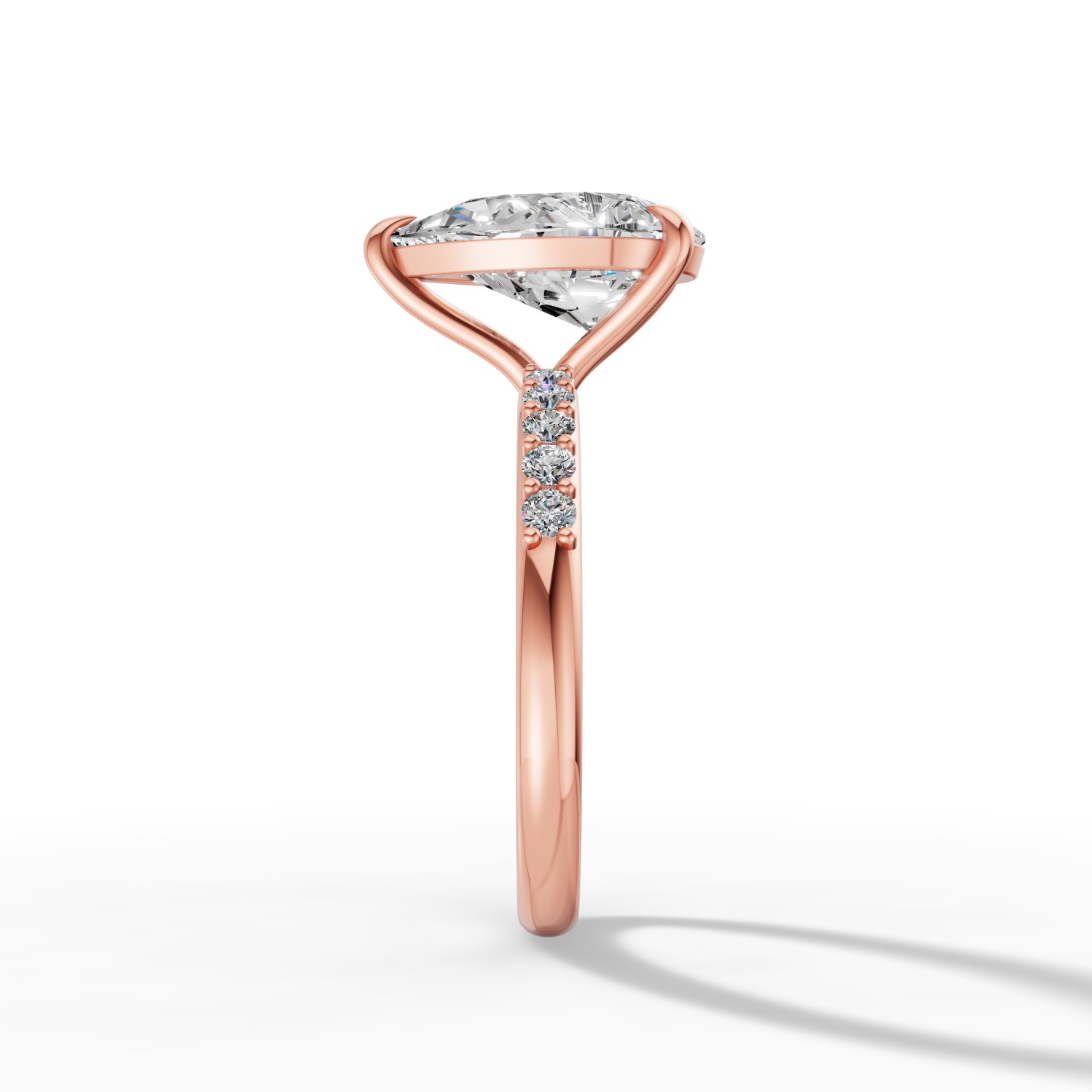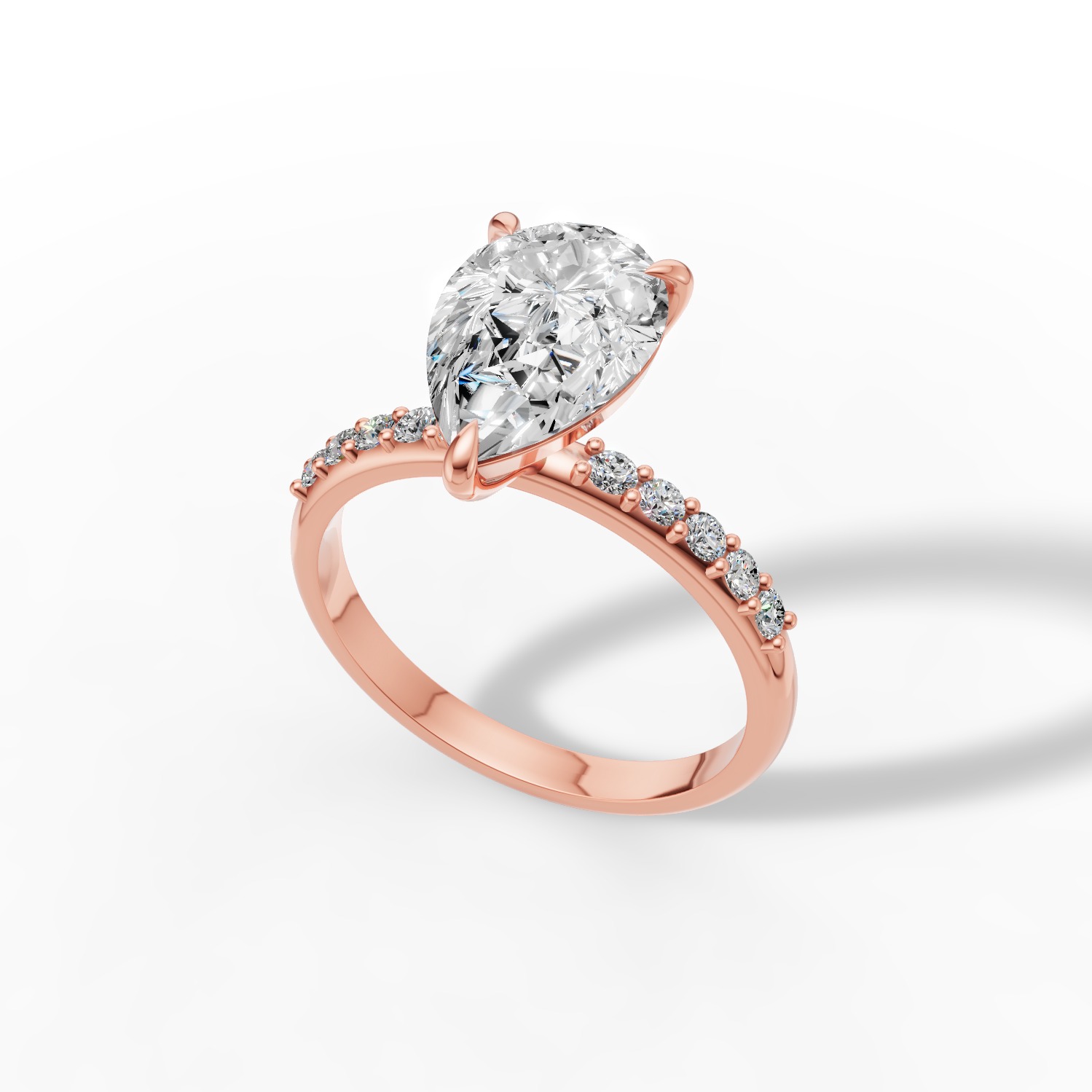Centralny diament w kształcie gruszki to nie tylko symbol wiecznej miłości, ale także wyraz indywidualnego stylu. Osadzony w oprawie z różowego złota oraz ozdobiony dziesięcioma drobnymi diamentami na obrączce, przyciąga wzrok czystym blaskiem i ponadczasową elegancją.